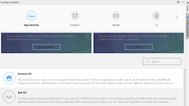 Coding Assistant 提供向导式的接入方式及场景化的代码模板,通过拖拽的方式生成,将HMS Core服务添加到您的应用中。