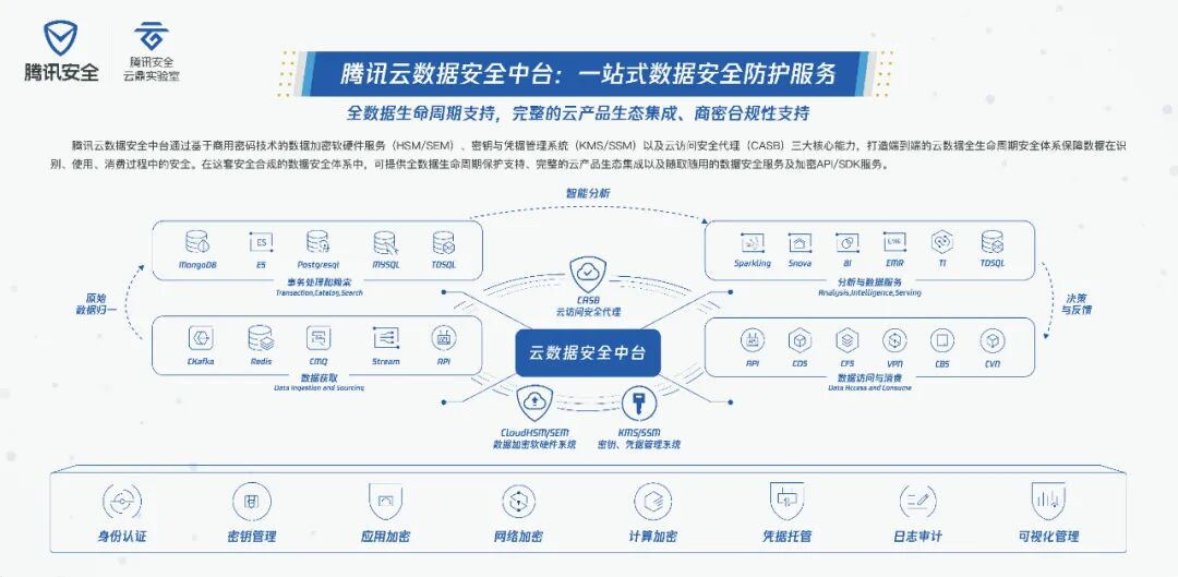 腾讯安全在本次案例征集中提交的腾讯云数据安全中台保护方案,综合了企业上云过程中面临的诸多门槛——如数据如何分类、治理和策略,如何进行密钥管理、事件监测分析、企业自身安全运维人员的密码学素养等等,通过基于商用密码的数据加密软硬件服务(HSM/SEM)、密钥与凭据管理系统(KMS/SSM)、云访问安全代理(CASB)三大核心能力,打造端到端的云数据全生命周期安全体系,保障企业在数据识别、使用、消费、存储、销毁全生命周期的安全。