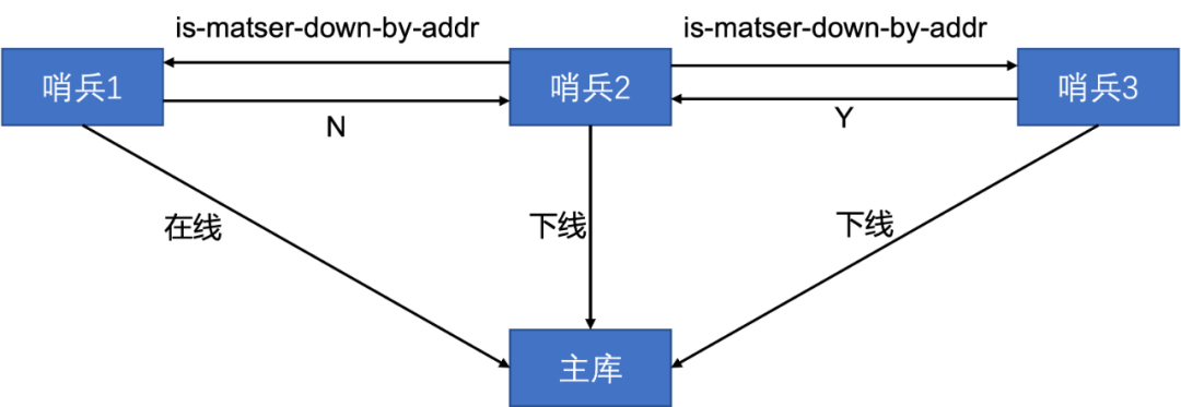 这个过程和判断主库“客观下线”类似,也是一个投票的过程。如果某个哨兵判断了主库为下线状态,就会给其他的哨兵实例发送is-master-down-by-addr的命令,其他实例会根据自己和主库的连接状态作出Y或N的响应,Y相当于赞成票,N为反对票。一个哨兵获得一定的票数后,就可以标记主库为“客观下线”,这个票数是由参数quorum设置的。如下图: