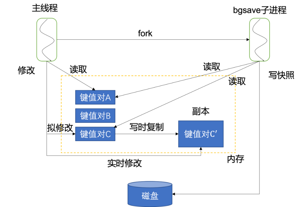- 如果主线程需要修改一块数据,如C,这块数据会被复制一份,生成数据的副本,然主线程在这个副本上进行修改;bgsave子进程可以把原来的数据C写入RDB文件。