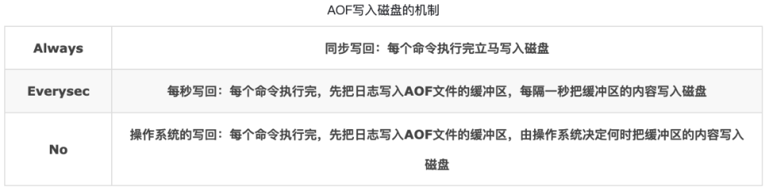 AOF为了避免额外的检查开销,并不会检查命令的正确性,如果先记录日志再执行命令,就有可能记录错误的命令,再通过AOF日志恢复数据的时候,就有可能出错,而且在执行完命令后记录日志也不会阻塞当前的写操作。但是AOF是存在一定的风险的,首先是如果刚执行一个命令,但是AOF文件中还没来得及保存就宕机了,那么这个命令和数据就会有丢失的风险,另外AOF虽然可以避免对当前命令的阻塞(因为是先写入再记录日志),但有可能会对下一次操作带来阻塞风险(可能存在写入磁盘较慢的情况)。这两种情况都在于AOF什么时候写入磁盘,对于这个问题AOF机制提供了三种选择(appendfsync的三个可选值),分别是Always、Everysec、No具体如下: