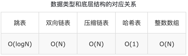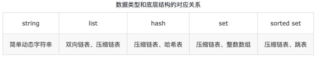 以上的数据类型是Redis键值的数据类型,其实就是数据的保存形式,但是数据类型的底层实现是最重要的,底层的数据结构主要分为6种,分别是简单动态字符串、双向链表、压缩链表、哈希表、跳表和整数数组。各个数据类型和底层结构的对应关系如下: