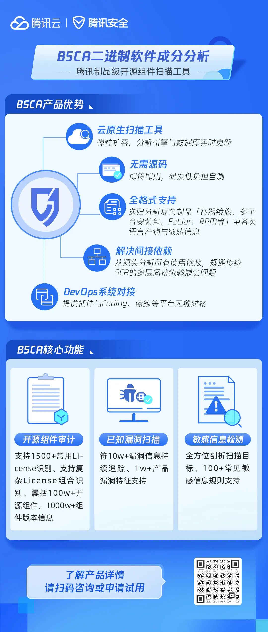 腾讯BSCA二进制软件成分分析工具,通过识别相关开源组件,自动化分析漏洞、许可、敏感信息泄露等软件供应链安全风险,是一款以二进制软件成分分析为核心的检测平台,可帮助用户检测软件制品、建立软件物料清单、发现软件制品风险、规避开源安全及合规性问题。