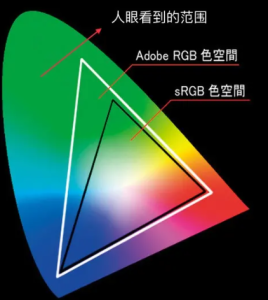 如下图,我们将 CIE、sRGB 和 Adobe RGB 的色彩范围换算到同一个平面上。最外围的色彩区域为 CIE 色彩空间,三角形部分为 sRGB 和 Adobe RGB。可以看到,sRGB 和 Adobe RGB 的色彩范围均小余 CIE,但是 Adobe RGB 的覆盖范围比 sRGB 更广,尤其是在绿色区域覆盖得更多(sRGB 大约能覆盖 35% 的 CIE,Adobe RGB 则为 50%),这使得 Adobe RGB 在摄像、图像处理、保真方面更游刃有余。