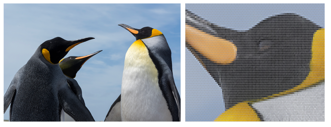 在上面的图片中,左图为正常尺寸的图片全貌,右图为放大一定倍数之后的局部截图(企鹅的头部)。